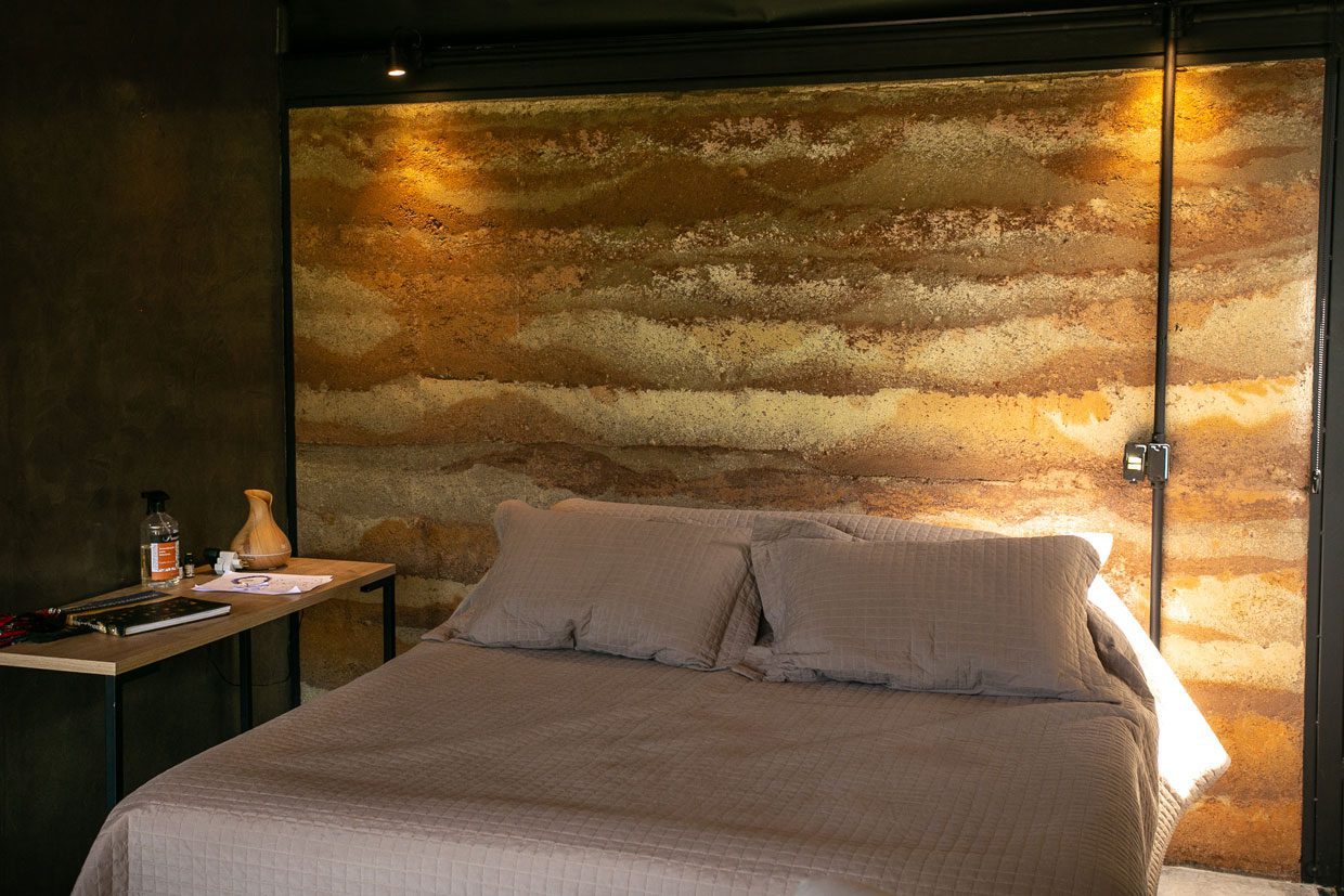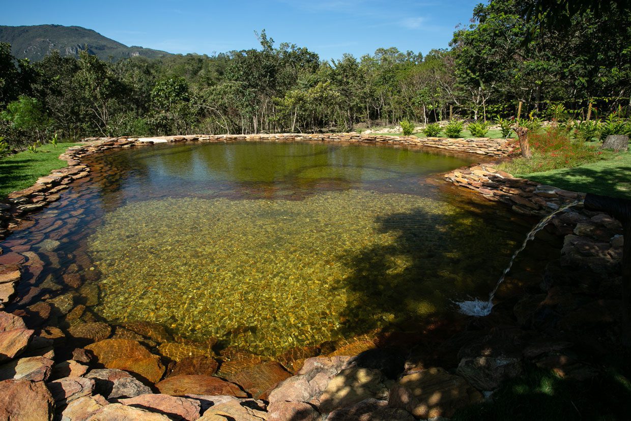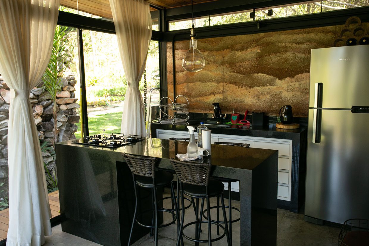 construção da pousada Terra Gaia, em Calvacante (GO), foi pautada na sustentabilidade e na valorização dos recursos locais. Os três chalés integrados à natureza foram erguidos com materiais regionais, como terra e pedras, e tecnologias que reaproveitam água e energia solar.