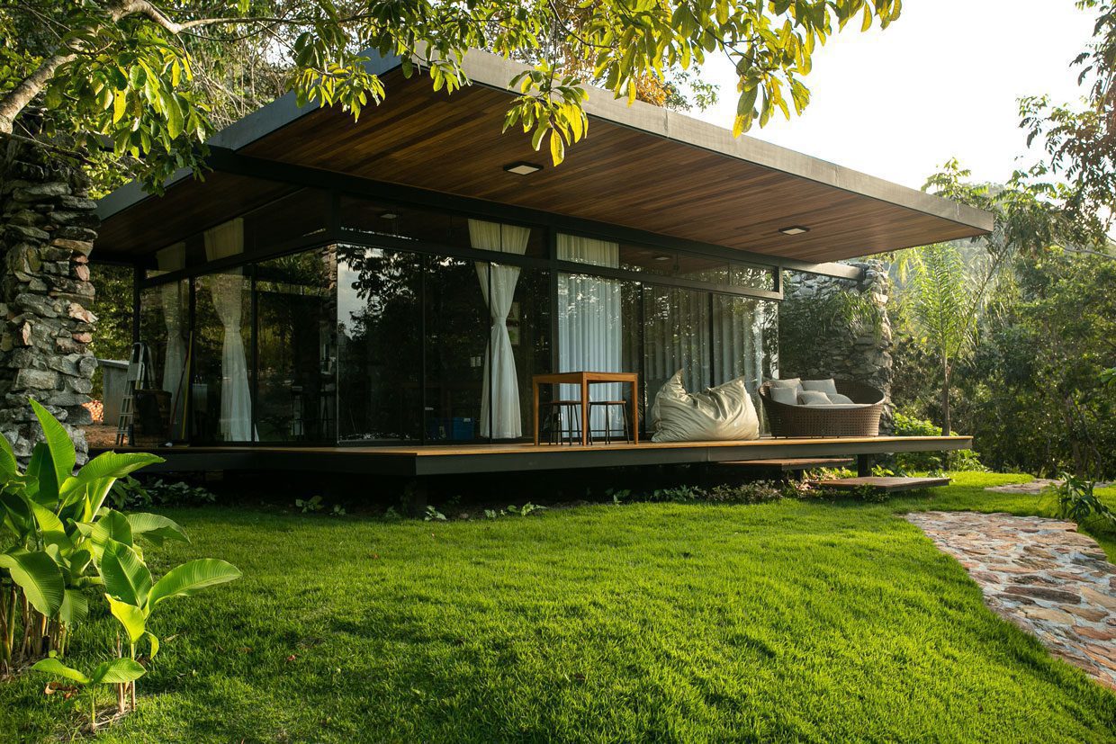 “Cada chalé é uma caixa de vidro temperado, protegida por empenas de pedras, adquiridas na região, e paredes de terras, também locais”, afirma Bruno.