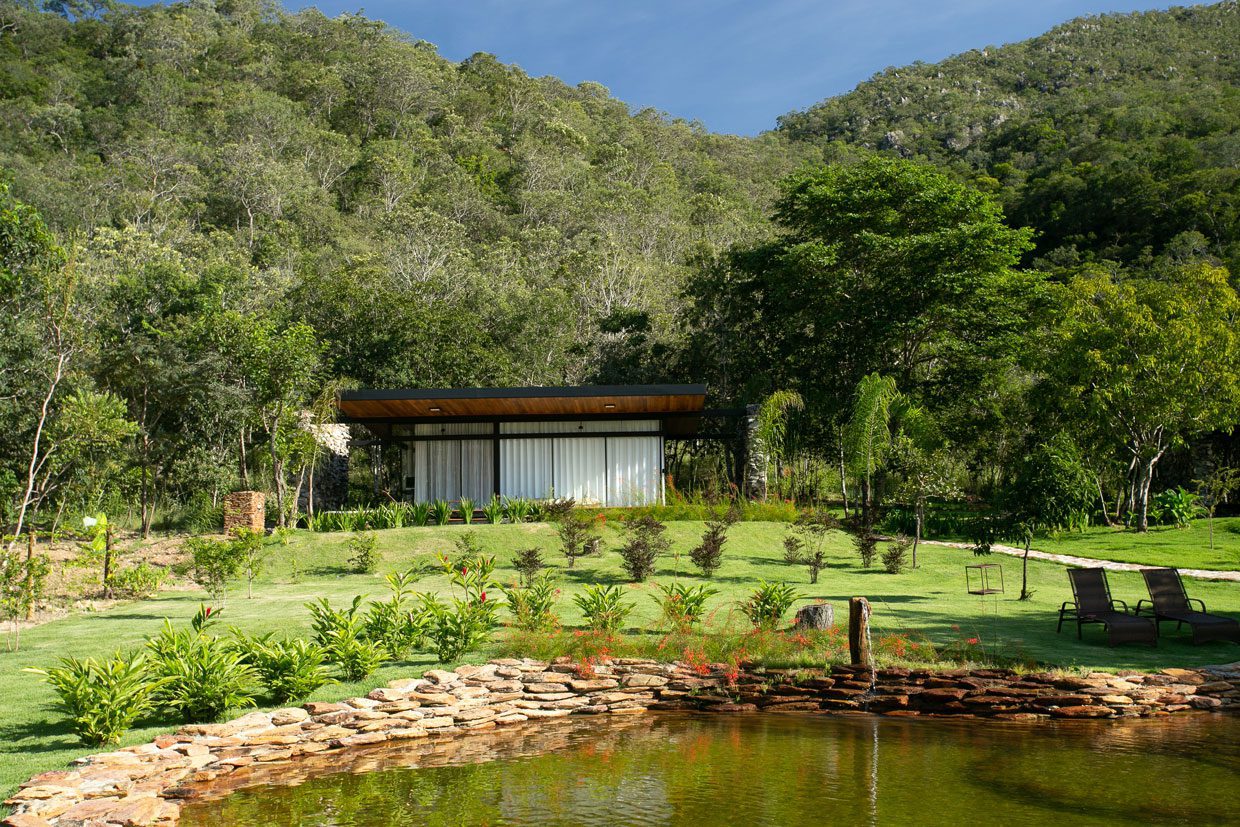 A fachada ao sul de cada habitação tem portas de correr que se abrem completamente para ter uma bela vista da Chapada dos Veadeiros. Com isso, o espaço interno se transforma em uma grande varanda com ventilação cruzada e abundância de luz natural.